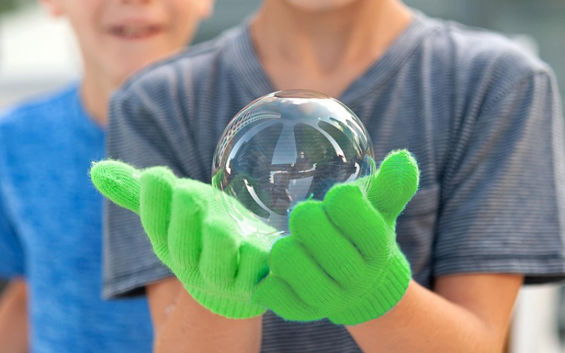 Un set per fer bombolles moooolt especial, les bombolles es poden agafar i tocar amb les mans sense que explotin! Això sí, necessitarem uns guants màgics que ens ajudaran a manipular-les.