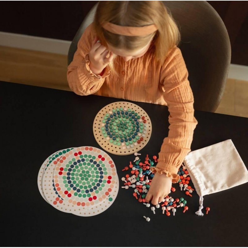 Es col·loquen els pius sobre el tauler seguint les targetes incloses o inventant les seves pròpies formes. Poden crear animals, figures geomètriques, paisatges o allò que sorgeixi en aquest moment. Els pius són ideals per a desenvolupar la motricitat fina.