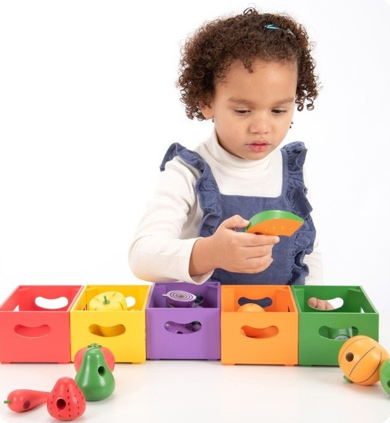 Comenzaremos escogiendo tres objetos de la misma familia, por ejemplo, tres prendas de ropa, tres piezas de fruta, tres colores (presentes en la caja de color nº1), y comenzamos con la presentación siguiendo el siguiente guion: