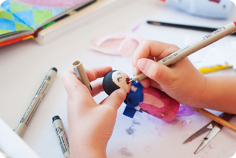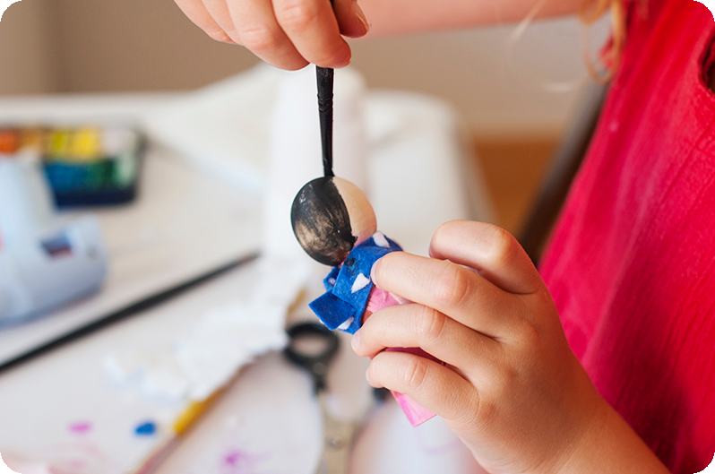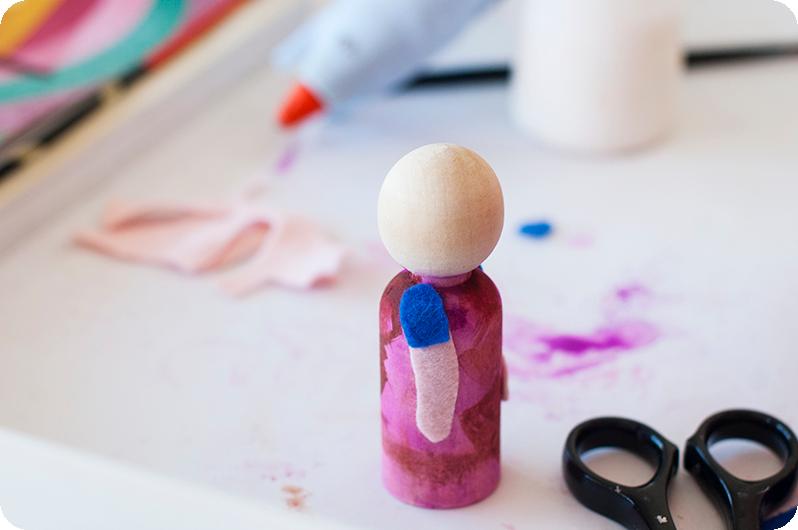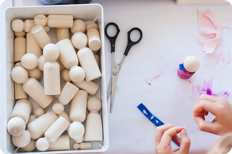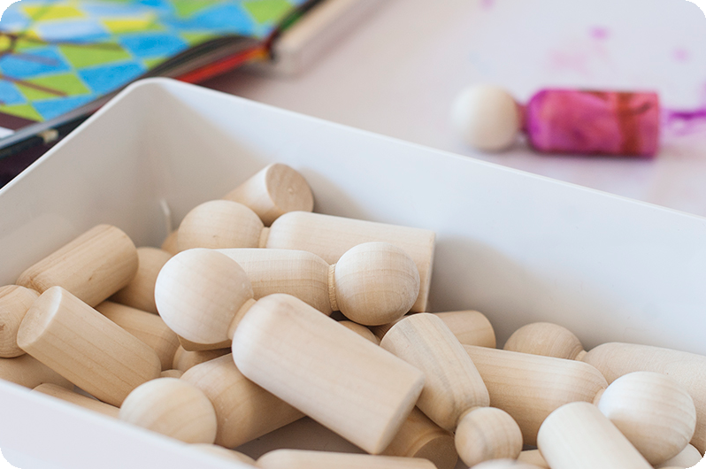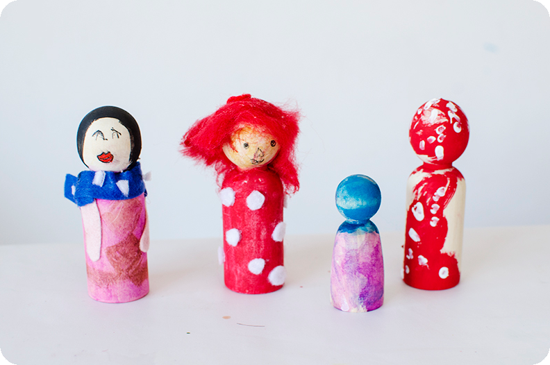 A estas muñecas de madera se las conoce como “peg dolls”. Vienen en una gran variedad de tamaños y formas. Nosotras usamos las grandes en esta ocasión, porque son ideales para la creación de estos personajes. La manera más sencilla de pintarlas es con acuarelas. También se puede usar témpera y pintura acrílica (la recomiendo solo para niños que no se metan nada en la boca), aunque nuestra favorita para esto es la acuarela.
