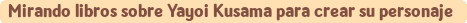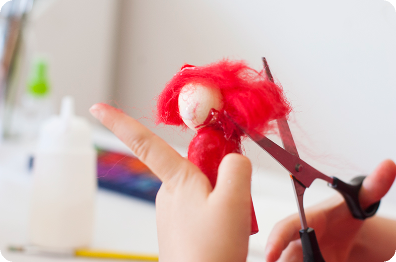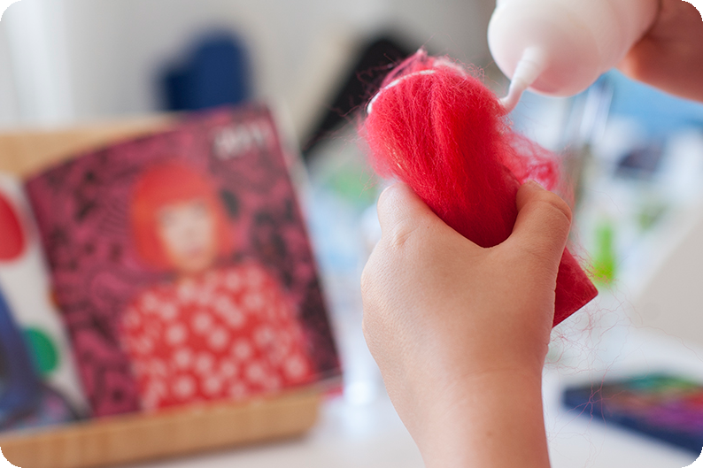 Primero se pinta la muñeca de madera con las acuarelas de forma libre. Cuando se acaba esta parte se pueden añadir los elementos que falten mediante el uso de otros materiales como la lana cardada peinada. Olivia miró cómo eran los trajes antes de pintarlos y decidió cómo hacer el pelo para cada caso. Para Yayoi, quiso usar la lana cardada peinada roja y luego cortarla para darle la misma apariencia que tenía Yayoi en la foto.